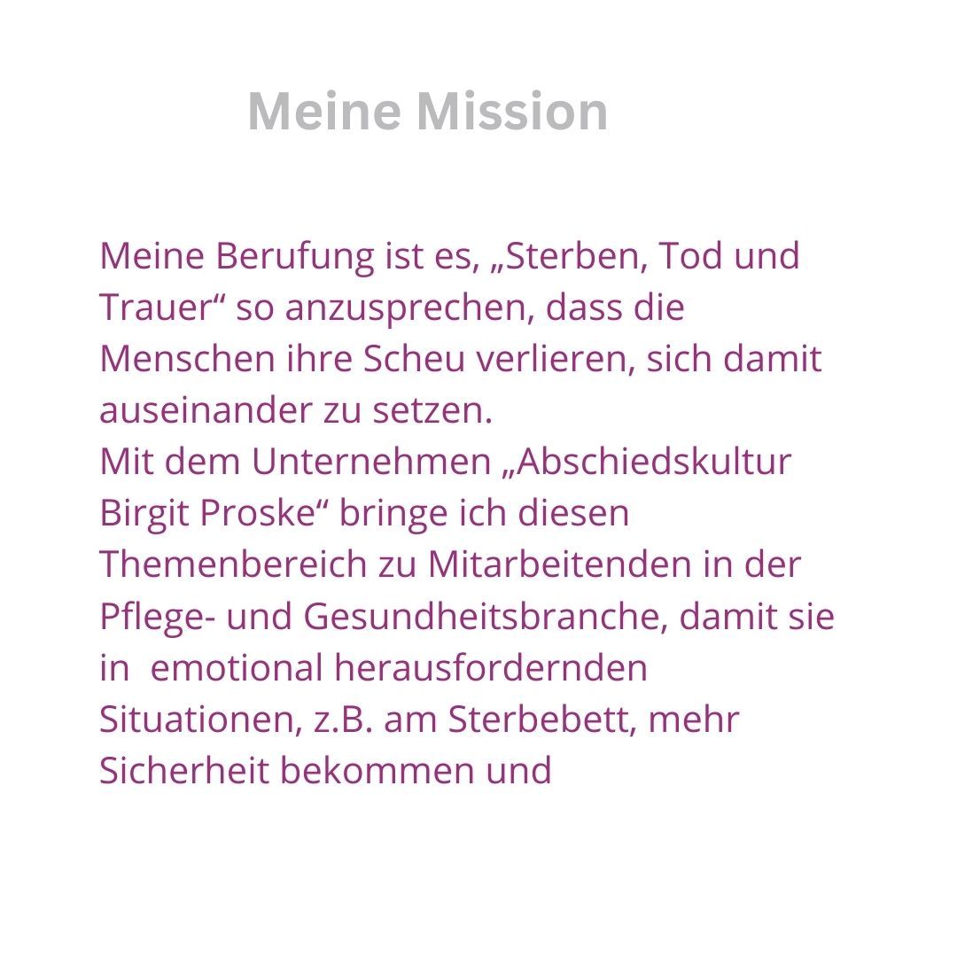 - 15.7.2020 Gründung von "Abschiedskultur Birgit Proske" zur Förderung der Themen um Abschied, Trauer, Sterben und Tod in unserer Gesellschaft;